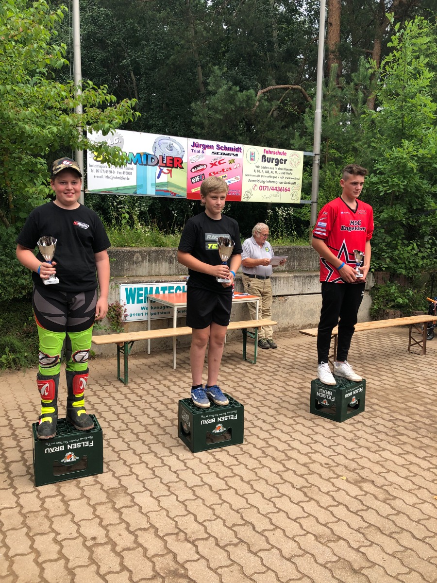 Dieses Jahr spielte auch das Wetter viel besser mit. Am Samstag hatten wir für die Zeit der Veranstaltung bestes Wetter. Am Abend stellte allerdings ein Gewitter, unser Versorgungszelt u. die Camper auf eine Bewährungsprobe. Das neue Vereinszelt musste mit Frauenpower u. Manneskraft am Boden gehalten werden, u. die Camper schwammen uns auch nicht davon. Da hatten wir noch einmal Glück. Am nächsten Morgen war es zwar noch nass aber die Bedingungen waren gut u. die Sonne schien auch schon wieder. Alles in allem, tolle Bedingungen für unsere Trial Sport Veranstaltung. Auch für Zuschauer u. Gäste waren die Bedingungen dadurch angenehm, u. es kamen reichlich interessierte Zuschauer. Ebenso besuchten uns viele der eingeladenen Gemeinderäte u. Bürgermeister die staunten nicht schlecht wie attraktiv u. professionell der MSC Engelsberg den Trial Sport betreibt, u. wie die Jugend dadurch gefördert u. unterstützt wird.