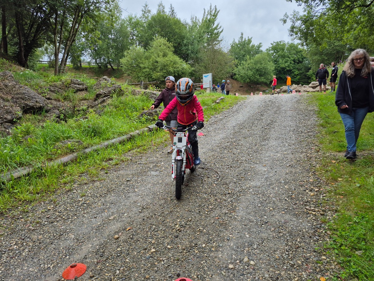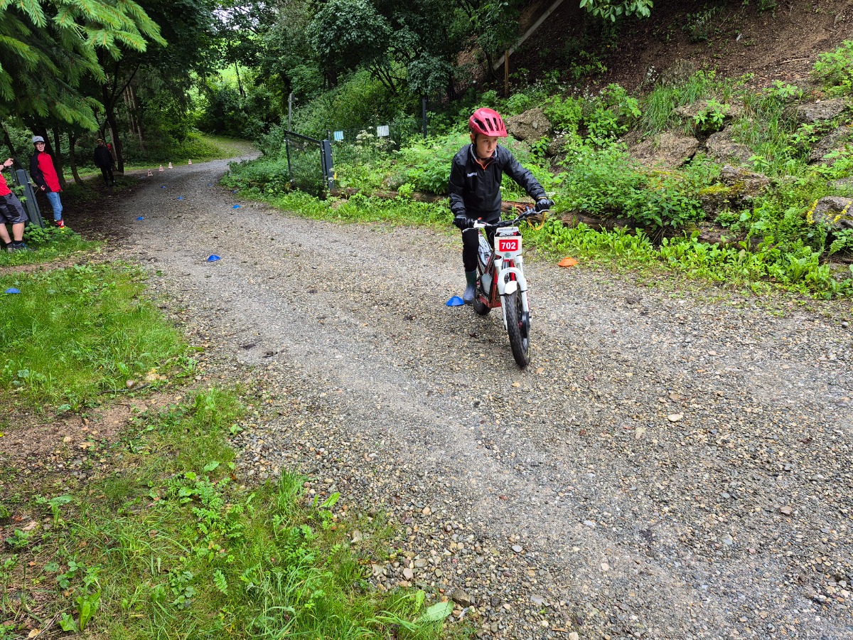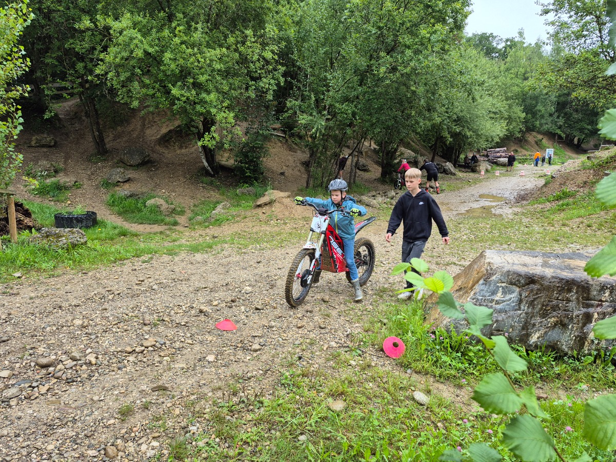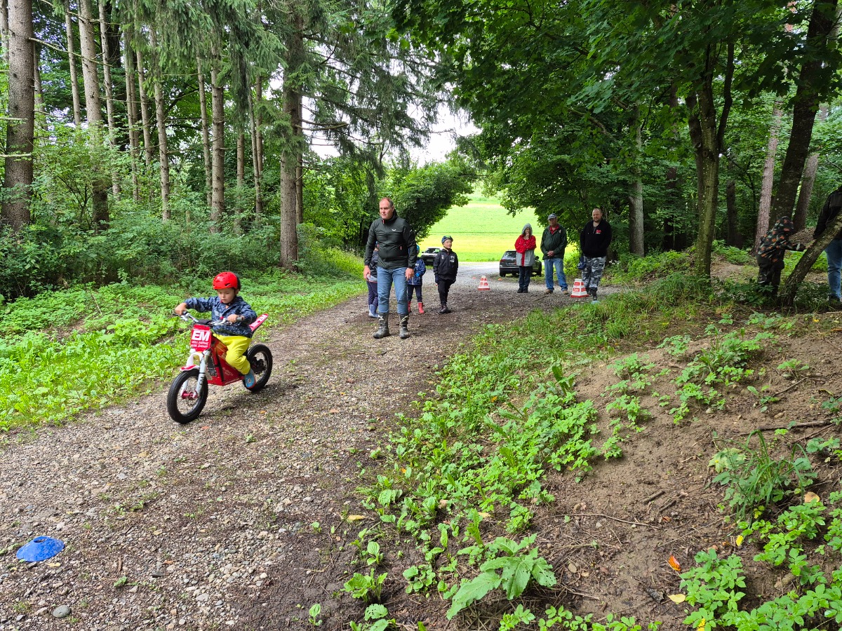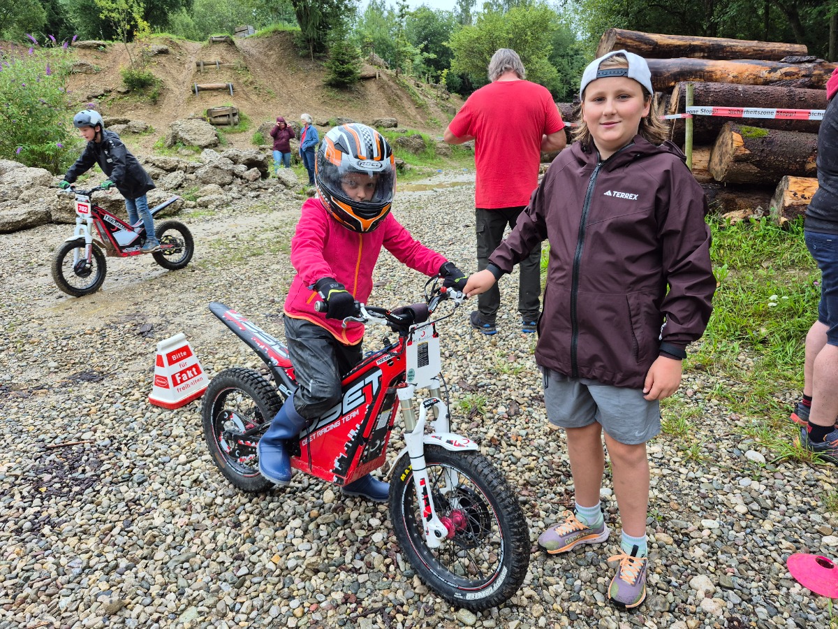 Letzten Samstag den 02.08.2025 kamen die Engelsberger Kinder wieder zu uns in den Trialpark des MSC Engelsberg. Die Plätze für das Ferienprogramm waren wieder sehr schnell ausgebucht, so das einige auf der Warteliste standen u. leider nicht teilnehmen konnten. Trotz des regnerischen Wetters hatten die Kinder im Alter von 7 – 11 Jahren ihren Spaß auf den Elektro Trial Motorrädern. Es dauerte nicht lange bis sie ein Gefühl für die Motorräder entwickelten u. immer sicherer durch die kleinen Hindernisse steuerten. Desto sicherer sie wurden, umso mutiger wurden sie auch, u. wagten sich schon einmal ins Gelände, was auch prima klappte. Die Anstrengung u. Konzentration auf den Motorrädern macht natürlich durstig u. hungrig. Dafür gab es zwischendurch auch Trinkpausen für die Kids u. zum Abschluss des Trial Fahrens noch Bratwurstsemmeln u. Pommes, was begeistert angenommen wurde. Um den Kindern einen weiteren Einblick in die Kunst des Trial Fahrens zu zeigen, präsentierten unsere MSC Trialer, vom kleinsten Fahren im Alter von 4 Jahren bis zu den Erwachsenen, was auf den Trial Motorrädern so alles bei ausreichend Training möglich ist. Die Vorführung verfolgten die Kinder u. auch die Eltern mit Begeisterung. Dafür gab es auch viel Applaus. Für die Betreuung der Kinder haben sich viele MSC Mitglieder eingesetzt. Vom Einweisen in die Fahrtechnik, beim Führen an schwierigen Hindernissen, bis zur Versorgung vom essen u. trinken. Ohne die Unterstützung der vielen motivierten Betreuer wäre das Ferienprogramm nicht so reibungslos u. erfolgreich durch zu führen gewesen. Dafür möchte ich noch einmal, allen Helfern für die erfolgreiche Veranstaltung, herzlich danken.