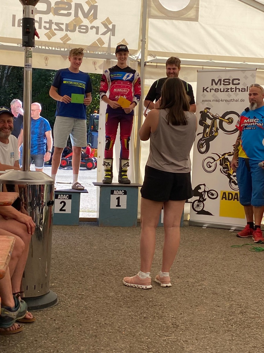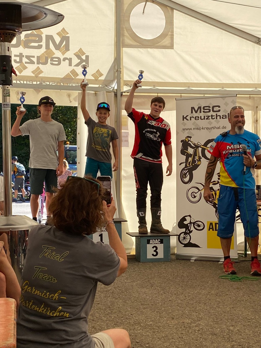 Am letzten Wochenende war der MSC Engelsberg mit 11 Trialfahrern beim MSC Kreuzthal am Start. Hauptsächlich die Jugend war stark vertreten, mit 8 Startern. Mit dabei waren: Nino Stadler, Lucas u. Lena Hartl, Andreas Kromp, Matteo u. Manuel Fanceschini, Matthias Geidobler u. unser Neueinsteiger im ADAC Alpenpokal Johannes Pietzsch. Trotz der großen aber normalen Nervosität bei seiner ersten Wettbewerbsveranstaltung konnte Johannes sich schon ganz gut präsentieren u. holte die ersten Wertungspunkte. Am Samstag lief es für Nino Stadler u. Lucas Hartl sehr gut u. die beiden sicherten sich einen Platz auf dem Treppchen. Nino wurde in der weißen Spur 2ter u. Lucas in der schwarzen Spur den 3ten Platz. Am Sonntag wurde es für Lucas Hartl aber richtig spannend. Es kamen vier Starter mit „0“ Fehlerpunkten durch die Sektionen. Das hieß die vier Jungs mussten ins Stechen in der grünen Spur. Lucas behielt die Nerven u. zeigte sein Können, so das er als Gewinner aus dem Stechen hervorging. Tolle Leistung Lucas! Schon das so viele Jugendliche, Kinder u. auch Erwachsene den MSC Engelsberg immer wieder erfolgreich präsentieren.