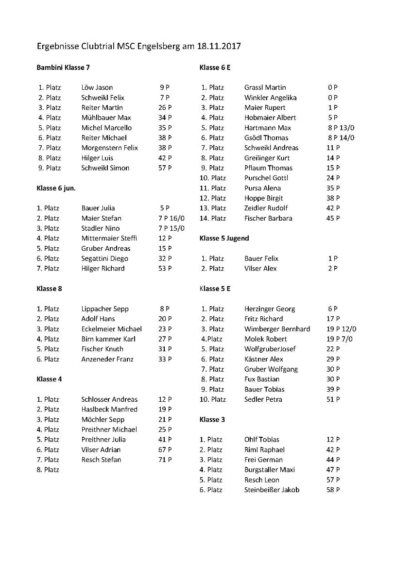 Zum Jahresabschluss werden beim Motorsportclub (MSC) Engelsberg e.V. im ADAC die Clubmeister geehrt. MSC Vorstand Gottfried Steinbeißer freute sich, dass auch heuer wieder viele Teilnehmer mitgemacht und ihre Ergebnisse gemeldet haben, so dass der neue Wanderpokal, der von Albert Hobmeier gestiftet wurde, gleich übergeben werden konnte. Die Clubmeisterschaft 2017 wurde auch heuer wieder nach bestimmten Punkten gewertet. Dabei mussten die Sportler mindestens 6 Starts aufweisen können, gewertet wurden die besten 8 Ergebnisse.